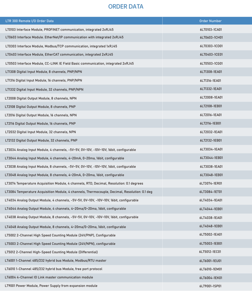 LTR300 Remote l/O Series blade-type modules will be an excellent choice for automation solutions for years to come. They are incredibly easy to install and boast outstanding continuous operational performance and fast response. Designed and continuously improved with various industry needs in mind, they are available in diverse variants to support extensive customization options.